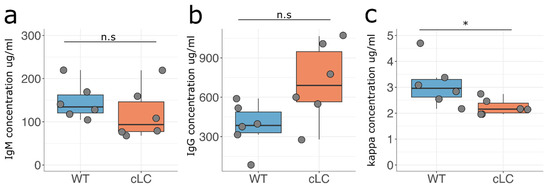 Antibody serum titers in wildtype and cLCM C57BL/6 mice. (a) IgM, (b) IgG and (c) kappa serum concentration of C57BL/6 mice (wildtype, blue, n = 6) and common light chain mice (cLC, red, n = 6). Measurements from individual mice are represented by a gray circle. The differences in concentration of IgM and IgG antibodies in serum of C57BL/6 mice and common light chain mice was not significant using Wilcoxon rank test. The kappa antibody concentration was determined to be significantly different (Wilcoxon rank test, * p-value < 0.05; n.s. not significant).