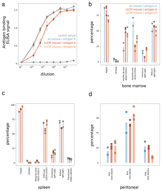 Naïve serum IgM titers and IgG titers in cLCM and wildtype C57BL/6 mice were determined using an IgM mouse ELISA kit (Abcam, Cambridge, UK) and an IgG mouse ELISA kit (Abcam) following the manufacturer’s protocol. Naïve serum kappa antibody titers were determined using a Mouse Kappa Light Chain (Sandwich ELISA) kit (LSBio, Lynnwood, WA, USA) following the protocol provided by the manufacturer’s protocol.