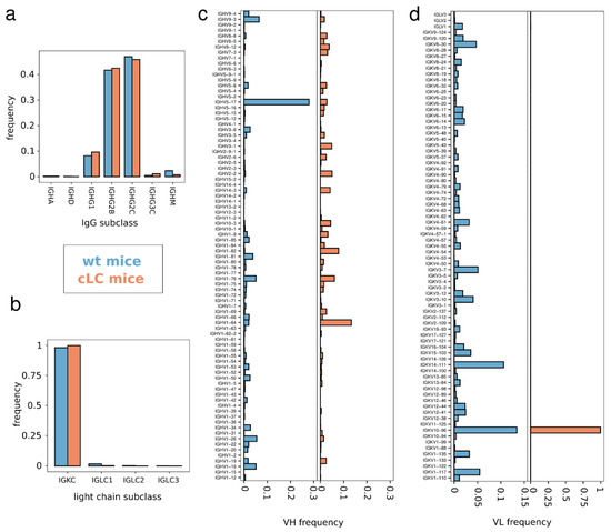 IgG subclass and germline usage of ovalbumin-specific antibodies; (a) subclass and IgG isotype distribution in the sequenced single-cell immune repertoire of OVA-immunized wildtype C57BL/6 mice (blue, n = 6089) and common light chain mice (red, n = 3716). (b) Light chain subclass distribution in the sequenced single-cell immune repertoire of OVA-immunized wildtype C57BL/6 mice (blue, n = 6409) and common light chain mice (red, n = 3394). (c) IGHV distribution in the sequenced single-cell immune repertoire of OVA-immunized wildtype C57BL/6 mice (blue, n = 6149) and common light chain mice (red, n = 3859). (d) Light chain V-gene usage distribution in the sequenced single-cell immune repertoire of OVA-immunized wildtype C57BL/6 mice (blue, n = 6427) and common light chain mice (red, n = 3429).
