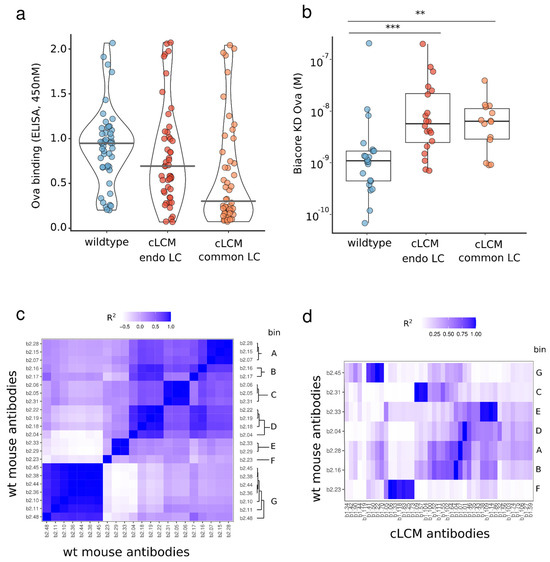 Characterization of ovalbumin binding properties of discovered antibodies. Ovalbumin binding of antibodies isolated from wildtype C57BL/6 and cLCM animals. Ovalbumin binding was assessed for 48 anti-ovalbumin clones selected from wildtype C57BL/6 mice and 48 anti-ovalbumin clones discovered from LCM with their respective endogenous light chain paired with the common light chain. (a). ELISA screening of ovalbumin binding (b). The binding affinity (KD) of ELISA-positive antibodies for ovalbumin is determined by Biacore 8K. Differences in binding KD were assessed using a Wilcoxon rank test. The KDs of the wildtype C57BL/6 clones were significantly different from the KDs of cLCM clones when paired with their endogenous or common light chain (adjusted p-value 0.00064 and 0.0032, respectively; ** indicate p-values < 0.005, *** indicate p-values < 0.001). (c) Epitope binning of 22 anti-ovalbumin antibodies isolated from wildtype C57BL/6 mice. Heatmap represents R2 values of the competitive binding profile of antibody pairs. A dark blue color represents high correlation between binding profiles of two antibodies while a light blue color represents a low correlation. The right Y-axis contains assigned epitope bins (A–G) based on the clustered R2 values. (d) Epitope binning of seven benchmark anti-ovalbumin antibodies isolated from wildtype C57BL/6 mice, representative of the seven identified epitope bins, against 43 cLC antibodies. A dark blue color represents high correlation (R2) between binding profiles of two antibodies while a light blue color represents a low correlation.