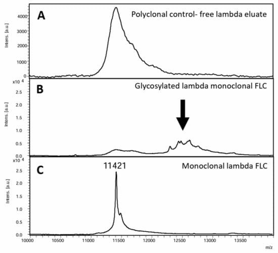 Intact light chain MS-based assays can detect light chain glycosylation. (A) shows an example mass spectrum from a polyclonal sample that has undergone immune enrichment for lambda FLC and then analysis by MALDI-TOF MS. (B) shows an example mass spectrum from a patient with a glycosylated monoclonal lambda FLC showing a polytypic hedgehog shaped peak with an increased m/z compared to the standard m/z region for the double charged light chains (highlighted by the black arrow). (C) shows an example mass spectrum from a sample with a lambda FLC monoclonal peak at m/z 11,421 for the doubly charged light chain peak. This figure is derived from a sample from the ALchemy study [103].