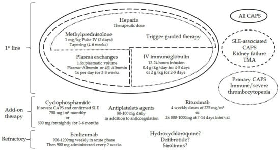 All CAPS considered, the highest survival rate has been achieved with a combination of anticoagulation, corticosteroids, and plasma exchanges (72%). The highest survival rates were reached in patients with SLE-associated CAPS who received anticoagulation, corticosteroids, and plasma exchanges (65%), and in patients with primary CAPS who received anticoagulation, corticosteroids, and IVIG (82%) []. Thus, as soon as the diagnosis is suspected, patients should receive anticoagulation and corticosteroids (first-line therapies) [], along with plasma exchanges, and/or IVIG [,,]. To date, no treatment modality has been prospectively studied in a randomized manner. Therefore, any recommendation represents low-level evidence and expert opinions. Furthermore, there are no studies evaluating the harmful effects or costs of these combinations of therapies in CAPS.