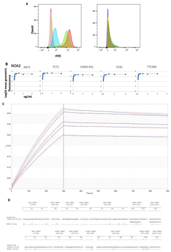 (A) (left) FACS for A673 Ewing sarcoma cells alone (purple), A673 cells incubated with a non-specific FITC-bound isotype control (orange), A673 cells incubated with 10 µg/mL of NOA1 (blue), 2 µg/mL of NOA2 (red), and 2 µg/mL of NOA3 (green). All three samples were incubated with a mouse anti-human FITC-conjugated secondary. The right panel depicts FACS for Kelly neuroblastoma alone and in each of the above conditions. (B) FACS demonstrating diminishing fluorescence with decreasing concentrations of NOA2 bound to A673, TC32, CADO-ES1, TC71, and TTC466 Ewing sarcoma cells. (C) OctetRED analysis for NOA2. NOA2 F(ab’)2 concentrations were as follows: 15 nM (Sensor A), 13.5 nM (Sensor B), 12.5 nM (Sensor C), 11.4 nM (Sensor D), 10 nM (Sensor E), and 0 nM (Sensor F). (D) Heavy and light chain sequences, comparative to germline, for NOA2.