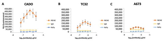 Antibody-dependent cell-mediated cytotoxicity (ADCC) assays were performed with the use of an ADCC Reporter Bioassay Core Kit (Promega, Maidson, WI, USA #G7010, G7018). Serial dilutions of NOA2 or an isotype control were plated with Ewing cells, or CD99-negative Kelly neuroblastoma cells, at concentrations ranging from 0 µg/mL to 2 µg/mL. Effector cells were plated at an effector-to-target cell ratio of 2.5:1 and incubated for 6 h at 37 °C with 5% CO2. A Bio-Glo Luciferase Assay was utilized to quantitate cell death. Plates were read on a POLARStar Omega plate reader and relative light units (RLU) were analyzed for each condition after subtracting for background. ADCC was performed in duplicate for each cell line. Error bars denote standard deviation.