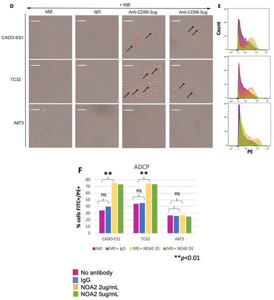 (A–C) Cell death of three human-derived Ewing sarcoma cell lines (CADO-ES1, TC32, and A673) by ADCC following incubation with anti-CD99 mAb and Jurkat effector cells. Kelly neuroblastoma cells were used as a negative control. (D) Light images obtained utilizing Celigo demonstrating aggregated, plump macrophages (arrows) actively engulfing Ewing sarcoma cells following incubation with NOA2 (labeled red with PKH26), i.e., ADCP. This finding was more prominent for the p53-wildtype cell lines CADO-ES1 and TC32 (A,D arrows). (E) A potential dose-independent increase in PKH26+/CD14+ cells (i.e., Ewing cells engulfed by macrophages) following treatment with NOA2 in CADO-ES1 and TC32, but this is not appreciable in the graphical representation of the data (F). ns = non-significant.
