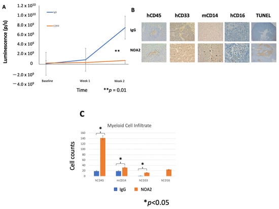 To investigate NOA2’s mode of action, mice were euthanized following therapy and livers dissected, embedded in paraffin, and sectioned (Figure 3B). The representative images demonstrate a more prominent human CD45, mouse CD14, and human CD33 and CD16 infiltrate. There was a statistically significant increase in human CD45+, mouse CD14+, and human CD33+ infiltrating cells (p < 0.05) in mice treated with NOA2 compared to IgG when averaged over three 10× high-powered fields. The differences for human CD16+ cells (p < 0.16) did not reach statistical significance, possibly due to small tumors and low overall cell counts (Figure 3C). In NOA2 treated mice, there was also a noticeable difference in the appearance of mouse myeloid cells staining for CD14; these cells were more plump and more aggregated than in IgG-treated tumors, suggesting macrophage activation, similar to that seen in in vitro ADCP studies. Anti-CD99 treated tumors also demonstrated pockets of necrosis indicative of apoptosis by TUNEL staining (Figure 3B).