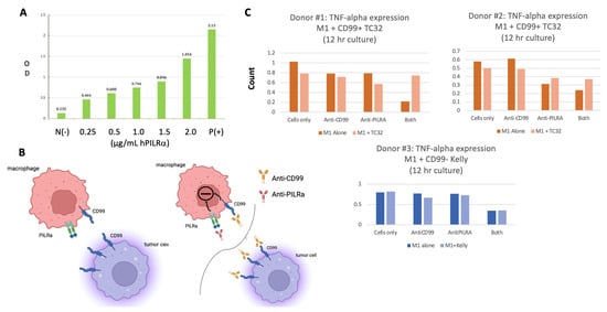 Monocyte-derived macrophages were isolated from PBMCs and identified as the cells left adherent following 5–7 days of PBMC culture. They were primed with 50 ng/mL IFNγ (Novus Biologicals, Centennial, CO, USA) and triggered for M1 polarization with 10 ng/mL lipopolysaccharide (LPS, Sigma Aldrich, Waltham, MA, USA) [24]. Twenty-four hours after LPS treatment, control group macrophages were incubated with one of three antibody conditions: anti-CD99 alone, anti-PILRα alone, or the combination of both antibodies. The experimental group macrophages were co-incubated with either CD99+ TC32 Ewing cells at a ratio of 2:1 (macrophage to Ewing cells) or Kelly CD99-neuroblastoma cells, and subsequently treated with each of the three antibody conditions. This experiment was performed with Ewing cells on two separate occasions using different macrophage human donors and in duplicate, using a third donor, with Kelly neuroblastoma cells. Twelve hours later, the supernatant was collected. ELISA was performed on the supernatant to assess changes in the concentration of TNF-α as a marker of macrophage activation (Abcam, Waltham, MA, USA).