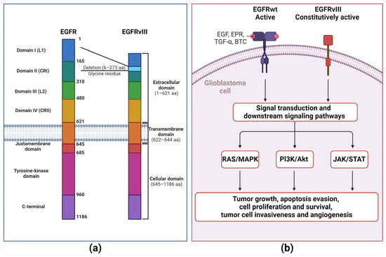 EGFR wild type and EGFRvIII mutated comparison. (a) The epidermal growth factor receptor (EGFR) comprises three domains: an extracellular domain, a transmembrane domain (hydrophobic), and an intracellular domain (distinctive of EGFRs from the TKI family and highly conserved). The extracellular domain comprises four smaller domains (DI-DIV). DI and DII are essential to ligand binding. EGFRvIII was obtained because the 801 bp in-frame deletion of 2–7 exons of the EGFR gene. (b) The extracellular domain interacts with numerous ligands, including epidermal growth factor (EGF) protein, EGFR-like growth factors, epiregulin (EPR), transforming growth factor-alpha (TGF-α), and betacellulin (BTC). EGFR is activated by ligand binding followed by dimerization, which provokes a conformational shift that further supports EGFR intracellular triggering by specific phosphorylated tyrosine residues (Y845, Y992, Y1068, Y1086, and Y1173) at the carboxyl-terminal domain, followed by activation of a complex program of downstream intracellular signals within the cytoplasm and nucleus, including RAS-MAPK, phosphatidylinositol-3-kinase (PI3K)/Akt and signal transducer and activator of transcription 3 (STAT3) pathways. These downstream signaling cascades prompt cell proliferation, loss of differentiation, invasion, angiogenesis, and inhibition of apoptosis. EGFRVIII maintains intact transmembrane and intracellular kinase domains, granting EGFRvIII independence of ligand binding to support further growth signaling in GBM cells and malignancy.