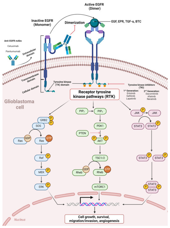 Therapeutic tyrosine kinase inhibitors and anti-EGFR monoclonal antibodies in glioblastoma anti-EGFR mAbs bind the EGFR extracellular domain, preventing EGFR dimerization and subsequent activation. Tyrosine kinase inhibitors (TKIs) target the intracellular TK domain, blocking subsequent receptor tyrosine kinase pathways (RTKs).