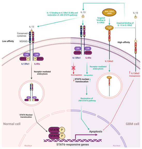 IL13Rα1/IL4Rα JAK-STAT6 pathway, IL13Rα2, and single-domain vNAR coupled to IL13Rα2. In normal cells, IL-13 binds with low affinity to IL13Rα1, and then IL13Rα1 forms the IL13Rα1/IL4Rα heterodimer with IL4Rα. IL13Rα1/IL-4Rα binding to the IL-13 cytokine stimulates STAT-6 intracellular signaling, resulting in receptor-mediated endocytosis (RME) and STAT6 translocation to the nucleus. IL-13Rα2 is a monomeric, high-affinity interleukin-13 (IL-13) receptor overexpressed in ~78% of GBM. IL-13Rα2 is absent or expressed at minimal levels in normal brain tissues. Anti-IL13Rα2 vNAR binds to IL13Rα2 on the GBM cell surface, then IL13Rα2 undergoes receptor-mediated endocytosis and hampers IL-13 binding to IL13Rα2. Consequently, IL-13 can normally bind to IL13Rα1/IL4Rα, further initiating the JAK-STAT6 pathway; this leads to the restoration of this signaling pathway that inhibits the abnormal unlimited proliferation of GBM cells and finally culminates in the apoptosis of these cells. Green dashed and green solid lines depict indirect and direct effects of IL13Rα2 impairment by targeted binding of vNAR, respectively. Red lines and the red cross depict IL13Rα2 inhibition of the JAK-STAT6 signaling pathway through IL-13 binding.