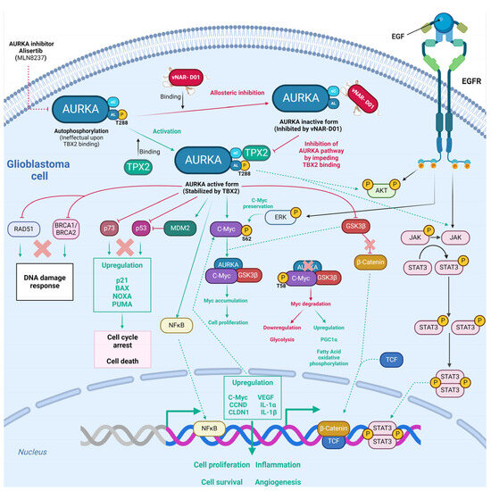 Potential allosteric inhibition of Aurora-A kinase by the vNAR-D01 intrabody. Aurora-A is a Ser/Thr protein kinase primarily involved in cell division and has been proven relevant for proliferation in glioblastoma. Moreover, Aurora-A induces tumorigenesis via the decontrolled regulation of RAD51 [128]. BCRA1, catenin, p73, MDM2, NFκB, cMyc, ERK, AKT, and JAK/STAT pathways [130], followed by downstream upregulation of several targets that prompt GBM cell proliferation, survival, inflammation, and angiogenesis. AURKA autophosphorylation is inefficient and relies on TPX2 binding. vNAR-D01 binding superposes to recognition sites of TPX2, further impeding AURKA kinase activity via an allosteric mechanism. Because the vNAR-D01 binding superposes to recognition sites of TPX2, the former impedes AURKA kinase activity via an allosteric mechanism. Green solid lines depict direct regulation, and green dashed lines depict indirect regulation. Red lines depict inhibition as well as red crosses. The vNAR-D01 3D structure was adapted for [122].