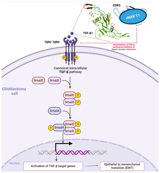 TGF-β canonical intracellular pathways and single-domain vNAR T1 coupled to TGF-β1. In the canonical pathway, TGF-β1 employs two serine/threonine kinase receptors to trigger messenger proteins (SMADs), followed by the activation of TGF-β target genes, which is essential to the onset and progression of GBM. As depicted in the example, TGF-β1 (green) is neutralized by recognition of vNAR T1 (blue) from [172], further hampering TGF-β1 binding to TβI/TβRII receptors. The amino acid sequence of vNAR T1 that recognizes the human TGF-β1 cytokine is depicted in red.