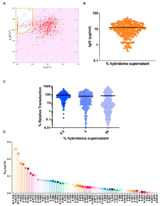 Massive characterization of huge panel of hybridoma supernatants. (A) Iso-affinity plot of hybridomas at a single dilution to evaluate the ka and kd. In the yellow box, the selected antibodies have better binding (affinity < 380 pM, displaying a kd <1 × 10−4s−1 and a ka >5 × 104 M−1s−1). (B) Total IgG amount for each analyzed sample (mg/mL) using Octet RED96 system (ForteBio). (C) VSV(Fluc_eGFP)-CoV2-PP pseudovirus assay using SARS-CoV-2 Wuhan variant. All hybridoma supernatants were screened in duplicates, with 3 concentration steps to evaluate their neutralization properties. (D) Obtained IC50 values for pseudovirus assay; the obtained values swing between 0.01 µg/mL to a maximum value of 0.25 µg/mL.