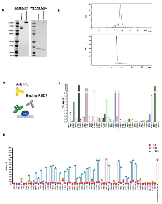 ELISA and FACS assays to characterize hybridoma supernatant properties. (A) Coomassie staining of purified hACE2 protein and WT RBD-6xHis in reducing and non-reducing conditions. Both produced proteins have been used in subsequent ELISAs. MW RBD-6xHis 26 KDa, MW hACE2 145 KDa. (B) SEC analysis of the hACE2 (upper) and WT RBD-6xHis (lower) to evaluate purity of the produced proteins. (C) Schematic representation of the competition ELISA assay performed on selected hybridoma supernatants. (D) Competitive ELISA, results are shown as A.U. (405 nm). High competing mAbs display low IC50 values. (E) FACS assay on hACE2-expressing Vero cells, using hybridomas culture media in three serial dilutions (1:2, 1:20, 1:200). Antibodies neutralizing the binding display 0% binding percentage.
