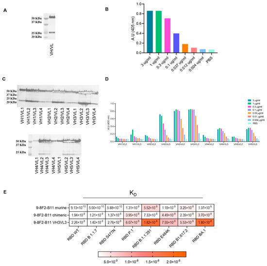Assessment of binding and productivity of chimeric and humanized 9-8F2-B11 antibodies. (A) Western blot analysis of 9-8F2-B11 chimera staining VH (MW 50 KDa) and VL (MW 25 KDa) fragments. (B) ELISA using 9-8F2-B11 chimera on WT RBD protein. Results are shown as A.U. (405 nm). (C) Western blot analysis of high-throughput production of VH (MW 50 KDa) and VL (MW 25 KDa) combinations of humanized 9-8F2-B11 to evaluate their productivity. (D) ELISA testing conducted on RBD WT protein to assess the performance of the best-producing humanized mAbs. The combination featuring VH3VL3 was selected for humanized 9-8F2-B11. Results are shown as A.U. (405 nm). (E) BLI assay to evaluate KD values of the selected 9-8F2-B11 murine, chimeric and humanized mAbs on a specific set of variants.
