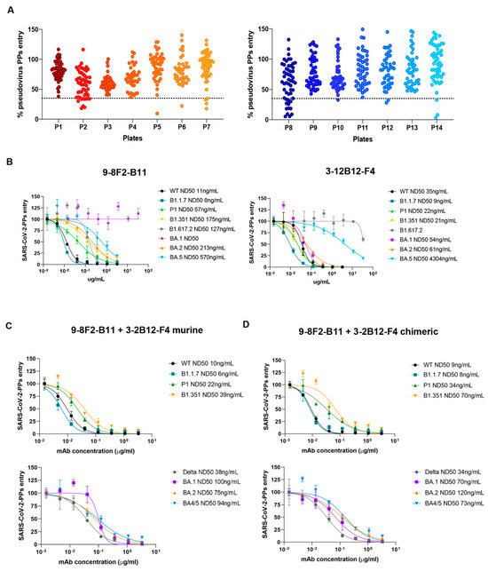 Among these, we selected 3-12B12-F4, an antibody that we further confirmed efficiently binds and neutralizes pseudoparticles of SARS-CoV-2 BA.1. This antibody was purified from the supernatant and then analyzed again using a pseudovirus assay. Together with 9-8F2-B11, 3-12B12-F4 was then further analyzed in decreasing dilutions on several SARS-CoV-2 variants (Figure 6B), including the BA.1/BA.2/BA.5 variants. Interestingly, while 9-8F2-B11 maintained its neutralizing ability in the nanomolar range for all tested variants except for BA.1, 3-12B12-F4 efficiently neutralized the latter. In addition, unexpectedly, 9-8F2-B11 instead neutralized the Omicron BA.5 variant, while 3-12B12-F4 showed reduced activity against both BA.5 and Delta (B1.617.2). Thus, this second screening identified a second antibody (3-12B12-F4) that had different, but complementary, neutralizing abilities to 9-8F2-B11. To assess their combined neutralizing breadth, we tested combinations of the two antibodies, both in their murine (Figure 6C) and chimeric formats (Figure 6D). Thus, for both formats, when combined, they have the ability to neutralize all the variants tested within the nanomolar range. The results underscore the significance of pseudovirus neutralization assays in evaluating antibody neutralization, and the diverse antibody library previously generated facilitated the rapid identification of 3-12B12-F4 as a potent neutralizer of Omicron BA.1, enhancing the neutralizing capacity alongside 9-8F2-B11.