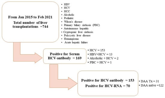 In this observational cohort study, we selected 153 liver allograft recipients with positive serum anti-HCV antibody titers detected during pre-LT evaluation from January 2015 to February 2021 from our liver transplantation program. During this period, a total of 744 cases met our criteria for further screening. Among 169 recipients with positive serum results for anti-HCV antibodies, 13 cases with positive serum HBsAg, 2 cases with alcoholic history, and 1 with primary biliary cirrhosis were excluded from our study. Furthermore, we also excluded those with negative serum anti-HCV antibodies, positive serum HBsAg levels, underlying psychiatric conditions, primary biliary cirrhosis, or alcohol-related liver disease, in addition to those with a pediatric LT history (see Figure 1).