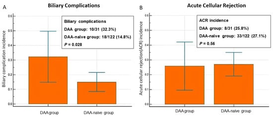 Comparison of biliary complications (A) and acute cellular rejection incidences (B) between the DAA group and DAA-naïve group.