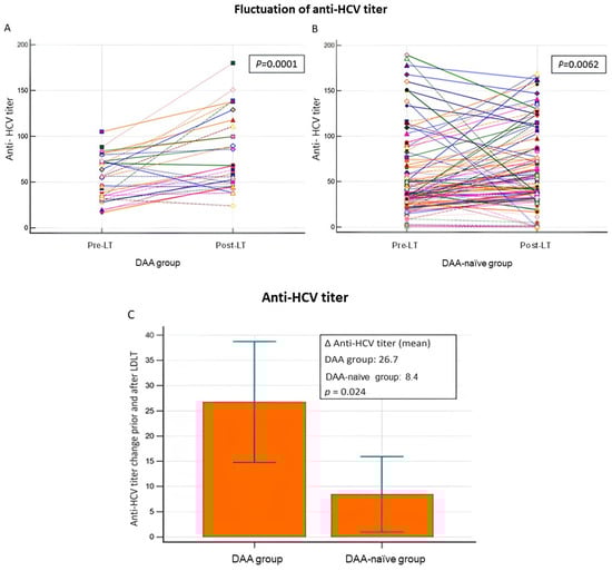 The crucial role of antibody responses in HCV infection has been noted. HCV-specific T-cell dysfunction and viral escape mutations are the main factors leading to chronic HCV infection [,]. HCV clearance is associated with both innate immunity and adaptive immunity, including the association with CD8+ T-cells, CD4+ T-cells, and B-cells []; notably, antibody responses and the development of neutralizing antibodies to antiviral immunity are closely related to CD4+ T-cell and humoral immune responses [,]. Recently, numerous studies have demonstrated the reversal of HCV-specific immune response after successful viral elimination via DAA treatment [,]. However, changes in antibody responses, especially fluctuations in anti-HCV antibody titers before and after DAA-mediated immune responses and HCV elimination, have never been investigated. The results of the current study reveal that the mean level of post-LT anti-HCV antibody titer upregulation was significantly higher in the DAA group, suggesting the restoration of immunity to HCV infection via pre-LT DAA therapy. This clinical finding still requires further validation to establish the exact immunological mechanisms underlying anti-HCV antibody titer fluctuation and DAA therapy.