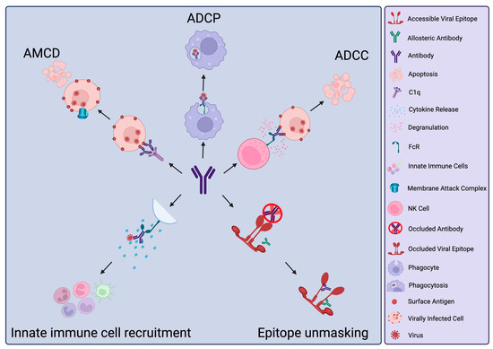 nNAbs can mediate protection through Fc (Fragment crystallisable)-mediated functions, such as innate immune cell activation, chemokine and cytokine release to regulate immune cell activation and recruitment [7], antibody-dependent cytotoxicity (ADCC), antibody-dependent cellular phagocytosis (ADCP) and antibody-mediated complement deposition (AMCD) (Figure 1). ADCC refers to the activation of innate immune cells, notably NK cells, to release cytotoxic granules containing perforin and granzyme. This process depends on NK cell FcγRIIIA engagement by Fc following antibody recognition of antigen on the surface of infected cells [8,9]. These cytotoxic granules form pores in the target cell membrane and activate caspases, leading to mitochondrial dysfunction and subsequent apoptosis of the infected cell. ADCP similarly relies on the interaction of Fc with Fc receptors (FcRs) expressed on phagocytic cells such as macrophages. This engagement results in the internalisation of the antibody-opsonised viral particles and their degradation within the formed phagolysosome [10]. Depending on the specific cell type that engulfs the opsonised viral particle, this also initiates further antiviral defences via increased immune activation through antigen presentation by macrophages or dendritic cells or cytokine release by plasmacytoid dendritic cells [10]. Neutrophils are also potent phagocytes and inducers of cytotoxicity through reactive oxygen species production [11]. In addition, neutrophils can undergo a specific form of cell death termed NETosis, where extracellular traps are expelled from the neutrophil to capture and degrade extracellular viral particles [11]. In AMCD, through the classical pathway, opsonising antibodies bind C1q molecules, initiating an amplification cascade of C3 convertase activation and C3 production before C5 generation by C5 convertase [12]. These, along with other complement components, assemble to form the membrane attack complex, which, analogous to ADCC, results in membrane permeabilization and induction of apoptosis of the opsonised virally infected cell [12].