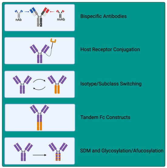 Fc modification can also enhance antibody effectiveness. These modifications include glycosylation [117], site-directed mutagenesis (SDM), or multimerisation to enhance avidity [118,119]. An example of such modification is commonly applied to NAb to extend serum half-life by introducing point mutations that alter binding to Fc receptors (reviewed in [120]). Other Fc modifications, such as defucosylation/afucosylation, enhance ADCC activity through enhanced FcR binding [120]. Likewise, Moore et al. demonstrated that a combination of IgG1 Fc mutations, S267E, H268F, and S324T, in anti-CD20 mAb increased affinity for C1q, resulting in an up to 6.9-fold increase in vitro complement fixation and induced cytotoxicity against Burkitt’s lymphoma Ramos cells [121]. Such Fc modifications are quite well established, and whilst typically applied to NAb and cancer therapeutics, they could similarly be applied to increase the effectiveness and serum half-life of nNAbs. More innovative approaches include that of Barrock et al., who describe a tandem Fc format whereby IgG and IgA Fc regions are combined in tandem in a single antibody, enabling exploitation of the Fc effector functions of each subtype [122]. This includes IgG1, known to be a potent activator of NK-mediated cytotoxicity, inducing ADCC with a long half-life, and IgA2, with a known role in phagocytic cell engagement and induction of ADCP [122]. Whilst this study focused on cancer mAb therapy and not nNAbs, this technology might be exploited to enhance the antiviral effector functions of specific nNAbs. Combining 2 Fc regions may increase the breadth of Fc effector engagement relative to single Fc region monoclonals. Together, these methods of functionalisation may yield novel therapeutic strategies against viral infection.