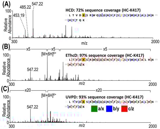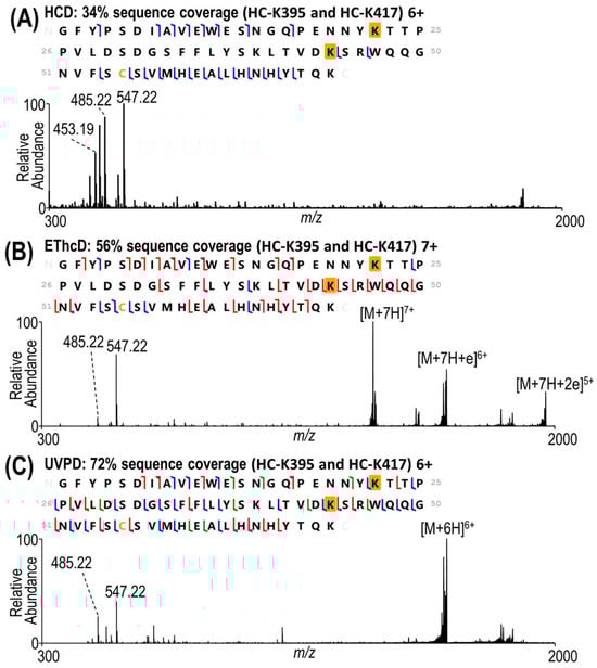 MS/MS spectra of a 4.5 kDa peptide (6+) using (A) HCD (30% NCE), (B) EThcD (charge-calibrated activation and 15% NCE supplemental activation), and (C) 193 nm (UVPD 2 pulses, 2 mJ per pulse). Sequence coverage maps along with sequence coverages are included for each spectrum. Lysine K5 of the peptide sequence shown here corresponds to K417 of the heavy chain of the antibody. The modified lysines are shaded in gold.
