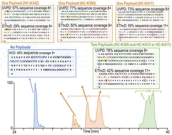 To identify and characterize peptides with multiple conjugated payloads, both the chromatographic data and the MS/MS spectra are examined. Figure 4 displays the extracted ion chromatogram for a peptide containing 101 amino acids with no payloads (blue trace), with one payload (orange trace), and with two payloads (green trace). The elution order of the three species offers one important feature. The payload is expected to increase the hydrophobicity of the peptide, resulting in a greater retention time as the number of payloads increases, as reflected in Figure 4. An HCD sequence coverage map is included for the peptide with no payloads. Given the high abundance and simplicity of this peptide, the HCD spectrum adequately characterizes it. Neither EThcD nor UVPD was triggered because the m/z 547.22 reporter ion was not generated by HCD. For the species with a single payload, three chromatographically resolved peaks were observed and attributed to three different conjugation states. Characterization of the peptide isomers containing a single conjugation at heavy chain K342 or heavy chain K395 was straightforward, with adequate diagnostic fragment ions generated by both UVPD and EThcD. Given the proximity of the two different lysine residues in this peptide (heavy chain residues K412 and K417), it is challenging to distinguish the exact conjugation sites for the third peptide isomer (tr 33 min). The third peptide is well characterized by both UVPD and EThcD. In both cases, there are fragment ions originating from backbone cleavages between heavy chain K395 and heavy chain K412, indicating that the payload must be conjugated to heavy chain K412 or heavy chain K417. The site localization is particularly compelling based on the UVPD sequence coverage map for which there are more backbone cleavages between heavy chain K395 and heavy chain K412. With UVPD, there were also five fragment ions differentiating heavy chain K412 and heavy chain K417, indicating unambiguously and with high confidence that the payload is conjugate to heavy chain K417.