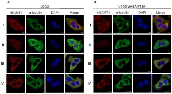 The target of the N6AMT1 antibody localises in the cytoplasm during interphase: (A) U2OS cells; (B) N6AMT1 knockout cells ΔN6AMT1#1, processed for immunofluorescence with primary antibodies specific to N6AMT1 (red): I (CQA1550), II (HPA059242), III (6211-1-AP), and IV (PA5-121076); α-tubulin (green) and secondary antibodies conjugated with Alexa-568 and Alexa 488. The cells were then counterstained with DAPI (blue) for DNA labelling. Images were captured using a Zeiss LSM 900 confocal microscope at 63× magnification. Scale bar, 10 μm.