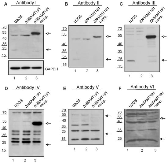 Immunoblotting with N6AMT1 antibodies. Lane 1—U2OS cell line; lane 2—N6AMT1 knockout cell line ΔN6AMT1#1; lane 3—N6AMT1 knockout compensatory cell line ΔN6AMT1# comp. N6AMT1 endogenous level in U2OS cells corresponds to 23 kDa (lane 1); no band at 23 kDa should be observed in knockout cell line ΔN6AMT1#1 (lane 2); recombinant N6AMT1-EGFP size corresponds to 55 kDa (lane 3). Immunoblot was performed with N6AMT1 antibody: (A) I (CQA1550), (B) II (HPA059242), (C) III (16211-1-AP), (D) IV (PA5-121076), and (E) V (ARP45845_P050), and (F) VI (Sc-517120). The band corresponding to endogenous N6AMT1 at 23 kDa is marked with a filled-in arrow, and recombinant N6AMT1-EGFP at 55 kDa is marked with an empty arrow.