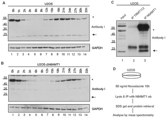 N6AMT1 polyclonal antibody recognises an unknown protein with a size of 45–50 kDa in U2OS cells. Mitotic cells of (A) U2OS and (B) ΔN6AMT1#1 were seeded, released from the mitotic block and collected at 0 h–33 h time points. Samples were analysed using N6AMT1 antibody I (CQA1550) and GAPDH. (C) Immunoprecipitation analysis in mitotic U2OS cells. Input (lane 1), TRMT112 (lane 2), and N6AMT1 (lane 3) antibodies were used for co-immunoprecipitation. Samples were analysed by immunoblotting with antibodies against N6AMT1. The band corresponding to N6AMT1 at 23 kDa is marked with an arrow, and the additional mitosis-associated band at 45–50 kDa is marked with an asterisk. (D) Experimental scheme of mass spectrometry analysis to identify the unknown protein that the N6AMT1 antibody I (CQA1550) recognises at 45–50 kDa.