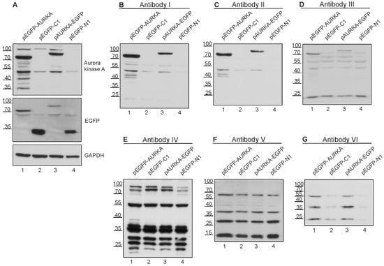To verify whether the N6AMT1 antibody recognises Aurora kinase A, plasmids expressing recombinant Aurora kinase A protein fused with EGFP were constructed. Plasmid pEGFP-AURKA expressed Aurora kinase A with EGFP at the N-terminus, and the pAURKA-EGFP plasmid expressed Aurora kinase A with EGFP at its C-terminus. The EGFP expression plasmids pEGFP_C1 and pEGFP-N1 without insertion were used as controls. The EGFP-AURKA (Figure 5A, lane 1) and AURKA-EGFP (Figure 5A, lane 3) proteins were expressed in U2OS cells and detected with EGFP and AURKA-specific antibodies as 72 kDa and 85 kDa fusion proteins, respectively. Next, the same samples were analysed with six N6AMT1 antibodies used in previous experiments: I, II, III, IV, V, and VI. As shown in Figure 5B–D, antibodies I, II, and III recognise recombinant Aurora kinase A-EGFP fusion proteins (Figure 5B–D; lanes 1, 3). The antibody IV showed many bands with different sizes, including a similar size to the AURKA-EGFP and EGFP-AURKA recombinant proteins; therefore, it was not possible to conclude whether antibody IV recognised AURKA (Figure 5E). Antibodies V and VI did not recognise recombinant or endogenous AURKA (Figure 5F,G). These experiments showed that three commercial N6AMT1 antibodies react specifically with Aurora kinase A.