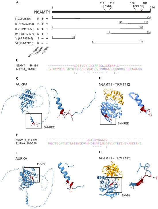 Antibody cross-reactivity usually occurs due to high similarities in protein sequences [34]. We used the BlastP sequence alignment tool with the default parameters [22] to screen for potential protein sequence similarities or motifs between AURKA (Uniprot accession O14965) and N6AMT1 (Uniprot accession Q9Y5N5). The alignment revealed two motifs present in both N6AMT1 and Aurora kinase A proteins (Figure 6). Figure 6A shows N6AMT1 immunogens used for raising antibodies and the location of these motifs within the N6AMT1 protein. Motif ENNPEE was found in N6AMT1 at position 176–181 and Aurora kinase A at position 107–112 (Figure 6B and Supplementary Figure S3), while motif EKVDL was found in N6AMT1 at aa position 114–118 and in AURKA 308–312 (Figure 6E). The Genomenet Motif finder tool was used against the KEGG Genes database to analyse further how common these motifs are and was set to only look for human proteins “https://www.genome.jp/ (accessed on 15 January 2024)”. The motif screening revealed that ENNPEE is rare and is shared only by two proteins: N6AMT1 and AURKA. The motif EKVDL is more common, and 26 different human proteins contain this motif. In addition to N6AMT1 and Aurora kinase A, the EKVDL motif is present in Aurora kinases B and C.