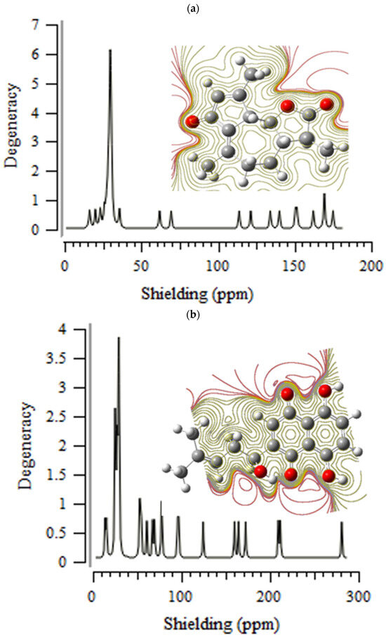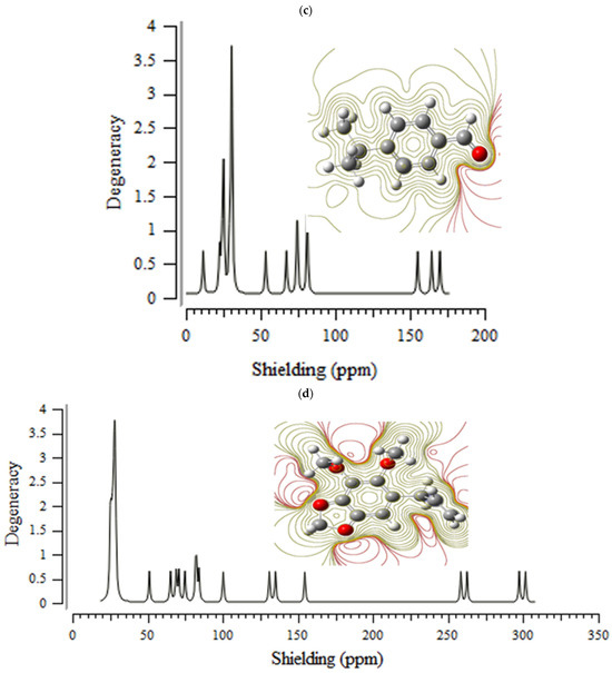 Achillin, alkannin, cuminaldehyde, dillapiole, estragole, and fenchone have approximately shown identical behavior (about 30–200 ppm) for different atoms in the interaction site of these substances with Tyr160-Met161-His162 through the “NMR” calculations accompanying electron spin density (ESP) (Figure 1). The strongest graph of “NMR” spectroscopy has been almost seen in 30 ppm for all principal ingredients of herbal medicine. The most fragile graphs of the “NMR” spectrum have approximately been observed between 50 and 200 ppm (Figure 1).