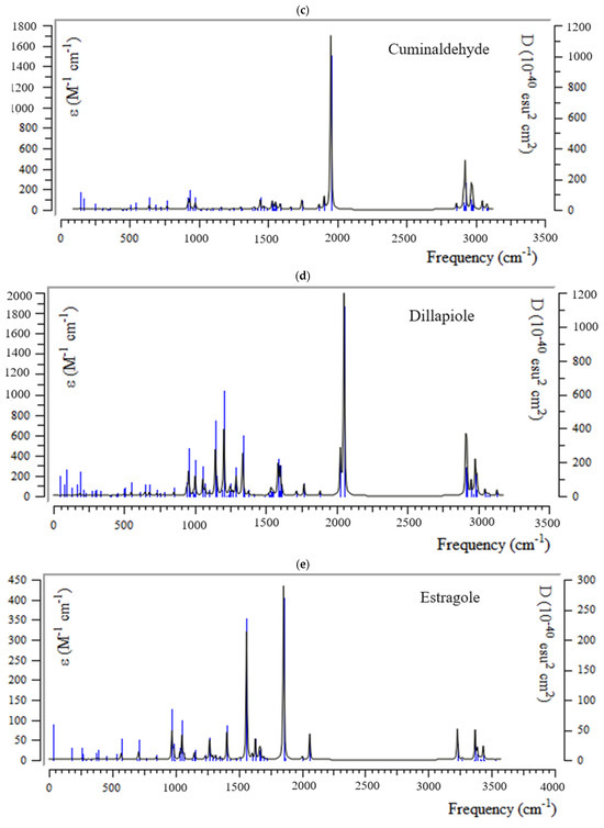 The graphs of “IR” spectra for (a) achillin, (b) alkannin, (c) cuminaldehyde, (d) dillapiole, (e) estragole, and (f) fenchone bound to “TMH” through the drug design approach achieved by m062x/cc-pvdz pseudo = CEP level of theory.