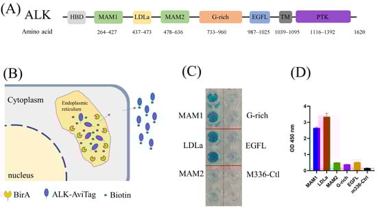 ALK is a single transmembrane protein with extracellular, transmembrane and intracellular domains (Figure 1A). The ectodomain is further divided into several subdomains, including MAM, G-rich region and EGFL domains with distinct functions []. To identify the ALK-specific antibody, we first utilized the recombinant full-length ALK ectodomain protein (ALK-ecto) to pan against our in-house proprietary antibody phage libraries []. Screening ELISA output dozens of positive clones. However, none of them bound with cell-surface-associated ALK, indicating the conformational difference between heterologous produced recombinant ALK protein and cell-surface-associated ALK. We then truncated the large ALK ectodomain into subdomains (MAM1, LDLa, MAM2, G-rich and EGFL) and expressed them individually in expi293F cells. Meanwhile, we utilized an in vivo biotinylation strategy to label those subdomains [], in which a BriA enzyme coding gene is co-transfected with ALK subdomains that are engineered to contain a C-terminal Avitag (Figure 1B). During protein expression, the BirA enzyme and our target proteins with AviTag were transferred into endoplasmic reticulum (ER). The BirA enzyme was retained on the ER catalyzes biotin specifically attaching to the lysine residue of AviTag (GLNDIFEAQKIEWHE). The biotin-labeled antigens were purified by Ni-NTA (SDS-PAGE) and their biotinylation efficacy was confirmed by ELISA (Figure 1C,D).