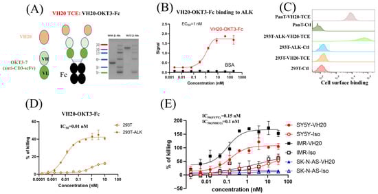 As a proof-of-concept study, a bispecific T cell engager was constructed by linearly fusing VH20 with the widely used humanized anti-human CD3 antibody single-chain variable fragment (OKT3-7-scFv) []. In order to enhance the binding activity and extend the antibody’s half-life, the tandem VH20-OKT3-7-scFv was fused with the human IgG1 Fc domain to generate VH20-OKT3-Fc (Figure 3A). VH20-OKT3-Fc was recombinantly expressed in Expi293 cells, and the purity of one-step protein A purification reached 95%, as revealed by SDS-PAGE (Figure 3A). VH20-OKT3-Fc specifically bound to the recombinant ALK-eco protein with an EC50 of ~1 nM without any binding to BSA (Figure 3B). In addition, VH20-OKT3-Fc retained binding to cell-surface-associated ALK on 293T-ALK cells. Its binding was specific, as no binding was observed in 293T cells. Moreover, VH20-OKT3-Fc bound to cell surface CD3 on PanT cells (Figure 3C).