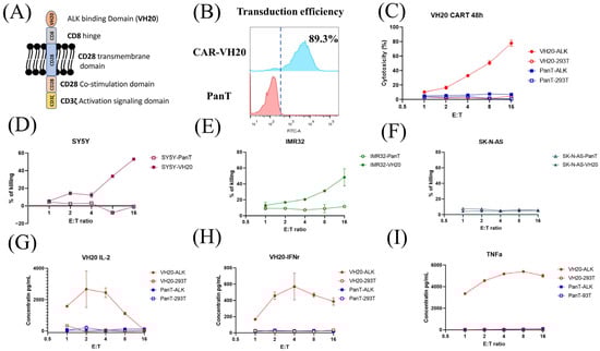 The cytotoxicity of VH20-CAR T cells was measured on 293T-ALK cells. The results showed that VH20-CAR Ts induced cytotoxicity of 293T-ALK cells at a E/T ratio as low as 1:1. VH20-CAR Ts eliminated the majority (78.1%) of 293T-ALK cells at a E/T ratio of 16:1 after 48 h of co-culture (Figure 5C). VH20-CAR T cells’ killing is specific, as no cytotoxicity was observed on ALK-negative 293T cells at any E/T ratios. Furthermore, we tested the VH20-CAR Ts’ killing of NBL cells (Figure 5D–F). The results showed that VH20-CAR Ts killed ALK-positive SH-SY5Y and IMR-32 cells in a E/T ratio-dependent manner. At a ratio of 16:1, VH20-CAR Ts eradicated 48.3% and 53% of IMR-32 and SH-SY5Y cells, respectively. The untransduced PanT cells did not show any toxicity towards ALK-positive IMR-32 and SH-SY5Y cells. Meanwhile, VH20-CAR Ts did not show cytotoxicity for the ALK-negative SK-N-AS cells, further supporting the specificity of VH20-CAR Ts.
