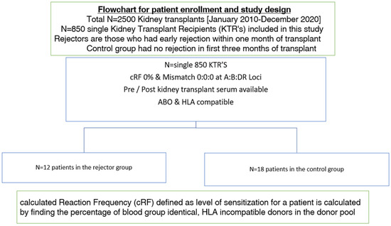 From a total of around 2500 kidney transplant recipients over a 10-year period, 850 HLA-specific-antibody-negative kidney transplant recipients (all receiving their first kidney transplant) were assessed for this study. All transplant patients were ABO- and HLA-compatible; were matched at A, B, and DR loci (mismatch 0:0:0); and were HLA-negative at the time of transplant operation. Of these, patients experiencing early graft rejection (n = 12) were selected alongside a cohort of 18 patients who were randomly selected as controls (Figure 1).