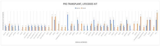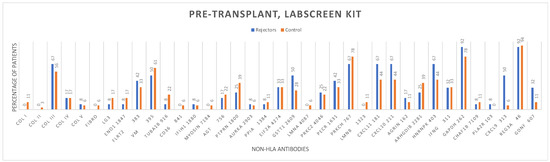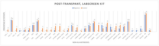 The distribution of non-HLA antibodies in the graft rejection and control groups before and after kidney transplantation, using the LABScreen One Lambda Kit from Canoga Park, CA, USA, is shown (Figure 2 and Figure 3).