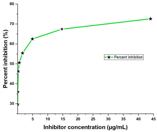 From the three-fold dilution, the results showed significant inhibition of the sample antigen in a dose-dependent manner, with the highest inhibition (72.66%) observed at a concentration of 44.00 µg/mL and the lowest inhibition (29.78%) at 0.02 µg/mL (Figure 2). The corresponding absorbance values were 0.538 and 1.382, respectively. In contrast, the ‘No Antigen Control (NAC)’ sample showed a much higher absorbance value of 1.968 (Table 3), indicating a strong binding response in the absence of the antigen. The inhibition of toxins in the crude D. polylepis venom was observed across all concentrations, with the highest antigen concentrations showing the greatest reduction in OD values compared to the No Antigen Control (NAC). This suggests that the primary antibody bound more efficiently to the toxins at higher concentrations, resulting in increased percent inhibition.