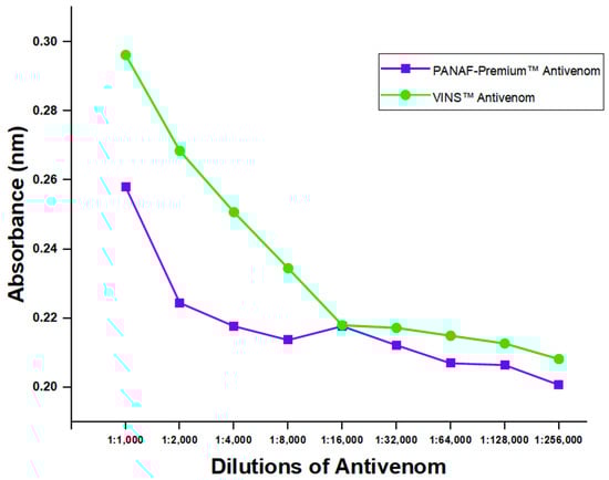 Two commercially available polyvalent antivenoms (PANAF-PremiumTM and VINSTM) were tested for the existence of toxins-specific antibodies using the developed indirect ELISA assay (thus, the assay’s ability to identify their presence in them). Despite the results showing higher detection for VINSTM, there were no varying detections observed beyond 1:16,000 dilution. It was revealed that antibodies in the antivenoms could be detected by the assay, even at the 1:256,000 dilution level (Figure 6). However, a comparison of the detection efficacy between PANAF-PremiumTM and VINSTM showed significant differences at all dilution levels (p-value = 0.0001).