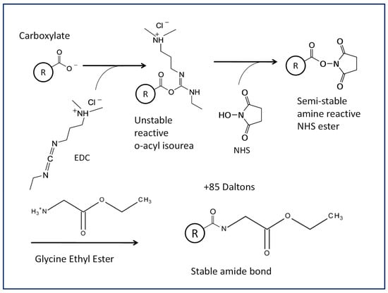 Labeling of antibody carboxylate amino acid (D and E) side chains or C-termini with primary amines (glycine ethyl ester, GEE) was achieved by activating the carboxylate group with carbodiimide (EDC, 1-ethyl-3-(3-dimethylaminopropyl)carbodiimide) and stabilizing the unstable amine-reactive product with NHS (N-hydroxysuccinimide) to form semi-stable amine-reactive NHS ester. Briefly, EDC and NHS (ratio of 1:2.5) were added to the antibody sample in 10 mM sodium phosphate buffer, pH 7.0, with various EDC to antibody carboxylate ratios (1:62, 1:1, and 10:1) at room temperature with constant mixing. After 15 min, GEE (GEE to EDC ratio of 1:1) was added to the reaction at room temperature with constant mixing for 2 h. Then, all labeling chemicals (EDC, NHS, and GEE) were removed by buffer exchange using Amicon® Ultra-4 centrifugal filter units (Millipore, Billerica, MA, USA). The general procedural scheme is illustrated in Figure 1.