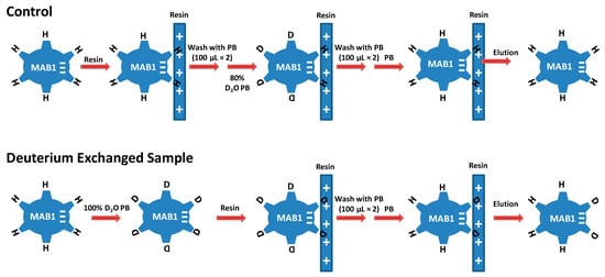 An MAB1 stock solution (13.4 mg/mL) was buffer-exchanged to sodium phosphate buffer (8 mM, pH 7.0 in 100% H2O) using a Microcon centrifugal filter with 30,000 MWCO (Ultracel YM-30, Millipore Sigma (St. Louis, MO, USA). The control sample of MAB1 was prepared by adding 7.5 µL of MAB1 solution containing phosphate buffer (in 100% H2O) to a 150 µL of Q Sepharose fast flow (FF) resin slurry (75% slurry in phosphate buffer) in an empty cartridge (Pierce). The cartridge containing the Q Sepharose FF resin and MAB1 was then centrifuged (~1000× g) for 5 s to remove all liquid. The same centrifugation force and duration were implemented for all subsequent procedures involving centrifugation. The cartridge was subsequently washed with 100 µL phosphate buffer twice. After washing, the phosphate buffer containing 80% D2O was added to the Q Sepharose FF resin/MAB1 to initiate H/D exchange. At the specific time points (i.e., 150, 500, 1500, and 5000 s), deuterium containing buffer was removed by centrifugation. The cartridge was then washed twice with 100 µL of phosphate buffer in H2O and centrifuged to remove liquid. An aliquot of 55 µL of an ice-chilled quench buffer (5.8 M GuHCl/0.8 M TCEP solution in H2O, pH 2.5) was added to quench the reaction by bringing down pH and temperature, and to elute the protein from the resin. The eluate was collected in a clean container after centrifugation and immediately frozen on dry ice and kept in a −70 °C freezer before data acquisition.