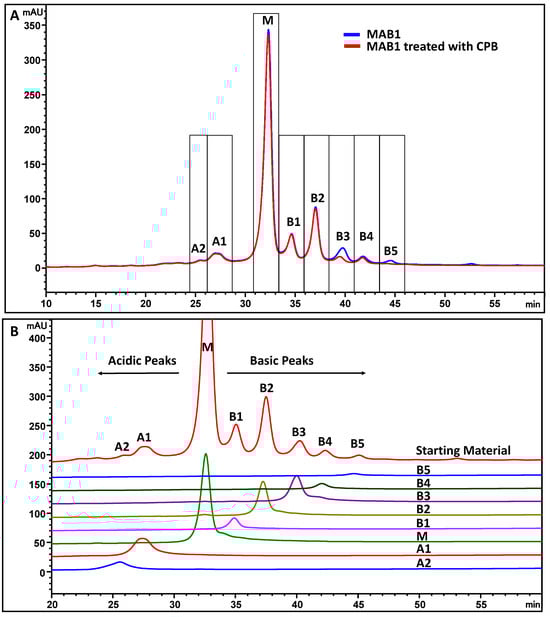 The AEX chromatograms (A) and AEX chromatograms of MAB1 CEX-isolated fractions (B).