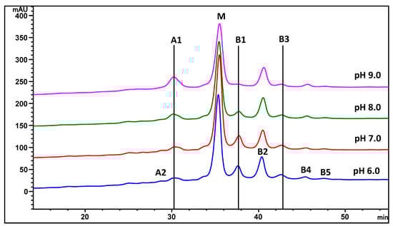 Peptide mapping coupled with mass spectrometry is a widely used technique for identifying and semi-quantifying peptides and their possible modifications. The tryptic peptides can be separated by reversed-phase HPLC and the identity of the peptides can be subsequently confirmed by mass spectrometry. The MAB1 peptide mapping profile showed that the pyroglutamate at the N-terminus of the heavy chain was a dominant modification for MAB1 but is less prominent in basic peaks B2–B5 (Table 1), especially for B2 and B4. It is expected that when glutamine is converted to pyroglutamate, it becomes more acidic due to the loss of the N-terminal primary amine [9]. In both the acidic and the main peaks, N-terminal pyroglutamate was nearly 100%, while deamidation at the constant region of the heavy chain was predominantly observed in the acidic peaks. Fraction B1 exhibited a relatively higher amount of succinimide intermediate in aspartate residues in the heavy chain variable region (Table 1). This succinimide intermediate is unstable and readily hydrolyzes to become aspartate or isoaspartate during sample preparation. The presence of succinimide intermediate in B1 and B3 was further confirmed when the MAB1 sample was buffer-exchanged to alkaline conditions (pH 8 and pH 9) and incubated at 37 °C overnight (approximately 18 h). This treatment resulted in the conversion of succinimide to aspartate or isoaspartate, while it remained stable at slightly acidic and neutral pH (Figure 5). The disappearance of B1 and B3, along with the increase in the A1 peak, suggested the presence of succinimide intermediates, which are known to be short-lived in alkaline conditions, as documented in the literature [39].