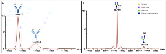 Mass analysis of MAB1 using SYNAPT G2-Si mass spectrometry (Waters). (A) The intact masses of deglycosylated MAB1 without C-terminal lysine and with one C-terminal lysine. (B) The heavy chain masses of MAB1 with G0F and G1F glycoforms.
