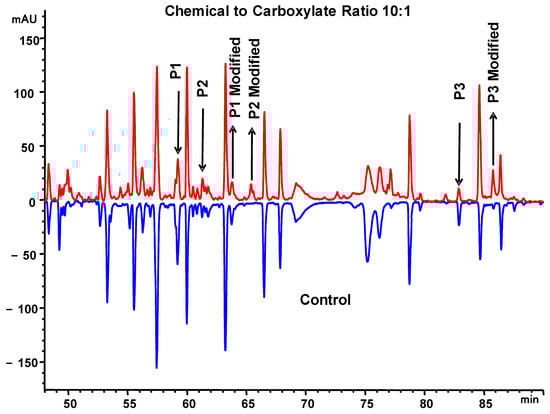 Mirror images of peptide mapping of monoclonal antibody MAB1. (A) Control; (B) chemical modification sample with chemical to carboxylate ratio of 10:1.