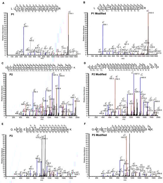 Collision-induced dissociation (CID) MS/MS spectra of MAB1 peptides. (A) Native peptide 1; (B) chemically modified peptide 1; (C) native peptide 2; (D) chemically modified peptide 2; (E) native peptide 3; (F) chemically modified peptide 3. Blue trace represents y ions and red trace represents b ions.
