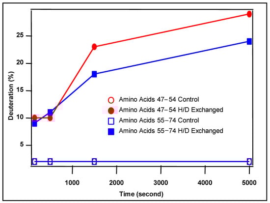 where m(P), m(N), and m(M) are the centroid value of partially deuterated, nondeuterated, and maximum-deuterated peptides, respectively. MaxD is the maximum deuterium level calculated by subtracting two and the number of prolines in the third or later position of the peptide from the number of amino acids in the peptide of interest. This is based on the assumption that the first two amino acids of the derived peptides cannot retain deuterium after RPLC separation. [33]. The deuterium recovery of a maximum-deuterated sample in this study was approximately 60% on average. The reported sequence number of each peptide corresponds to the actual sequence of the peptide without truncation of the first two amino acids that are expected to carry no deuterium.