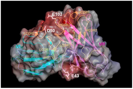Structural model of MAB1 Fv in electrostatic surface and cartoon representations. The molecular surface is colored by the electrostatic potential (red, negative; blue, positive), starting at 10 kT/e. Light chain variable domain (VL): cyan; heavy chain variable domain (VH): magenta; CDRs (based on Kabat database): orange. Negative-charged residues with confirmed chemicals.